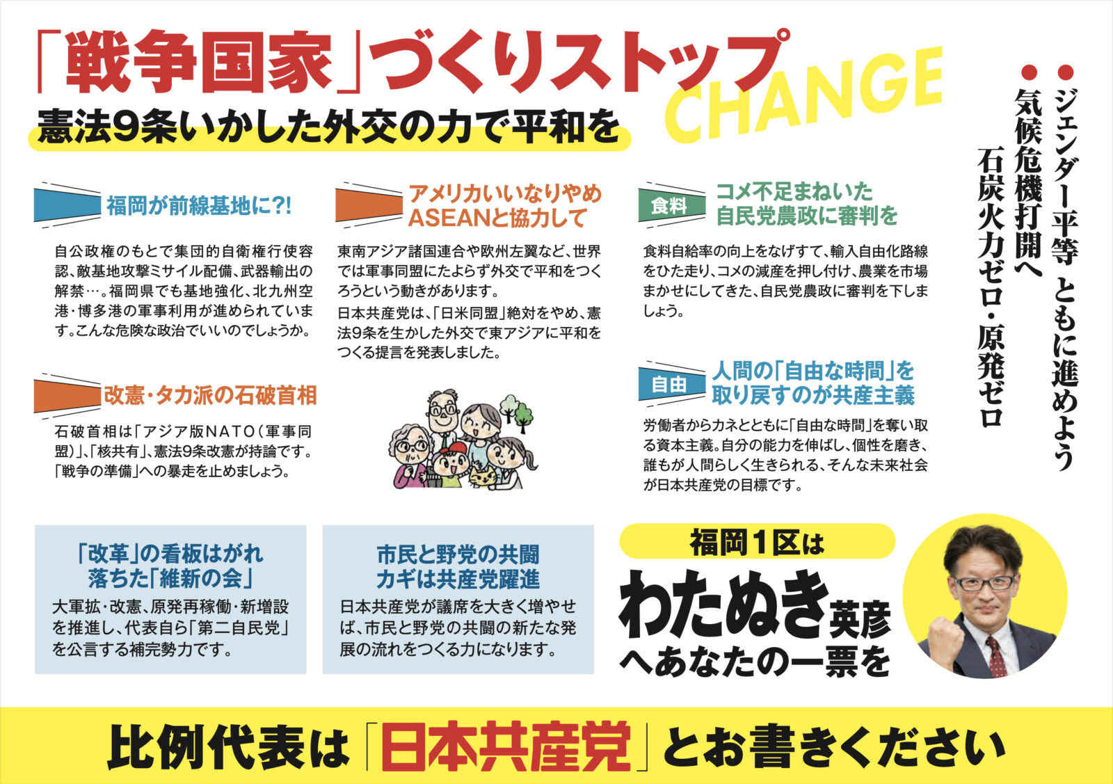 わたぬき英彦は、16年間、市議会議員として、市民の命と健康、生活と権利を守るために一生懸命働いてきました。税金の無駄遣いや大企業ばかりをもうけさせる政治を追及してきました。医療機関での仕事の経験をいかして、みなさんの願いである医療や教育の充実のため、こんどは国政にチャレンジする決意をしました。