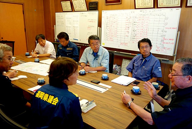 市商工会では岩下繁隆会長、朝倉商工会議所の窪山龍輔事務局長らと会談。岩下氏は、会員の3分の1が被災し高齢者も多いとし「高齢で重たい借金は担げないと言う方も多い。被災した事業者を何としても守ってほしい」と訴えました。業者側から「流木を個人でと言われるが、とても無理」「現時点では融資しかなく商工業は支援が薄いと感じる」と要望が寄せられました。