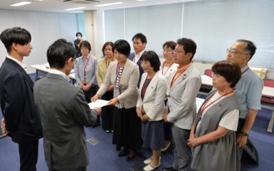 申し入れでは、オスプレイが重大事故を繰り返していると指摘し、配備中止や九州地域での夜間・低空訓練の中止、オスプレイの全機撤去を求めました。10月12日告示の佐賀市議選に立候補する山本愛氏らが申し入れ書を手渡しました。